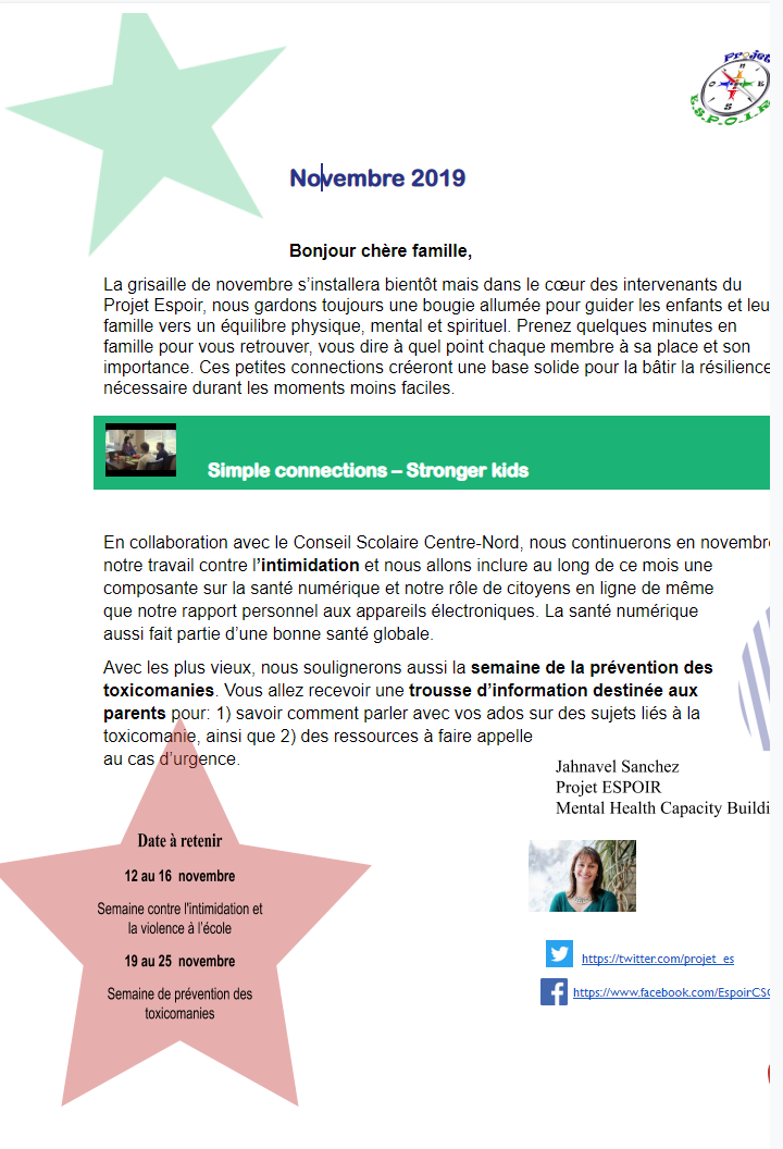 Projet Espoir, lettre mensuelle, cliquer ICI.