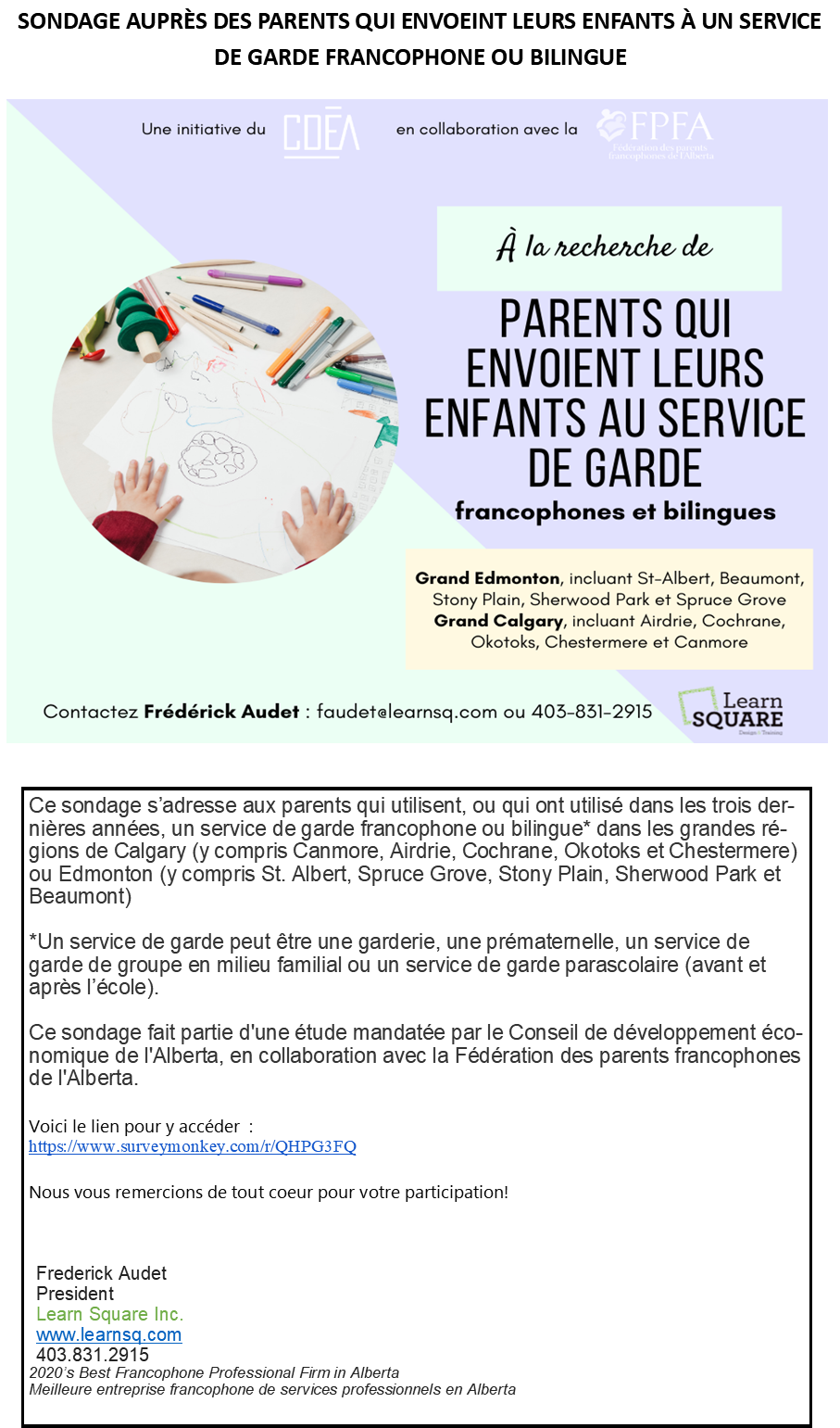 Voir la publicité de Learn Square en collaboration avec la FPFA - Sondage auprès des parents qui envoient leurs enfants à un service de grade francophone ou bilingue, cliquer ICI.Merci