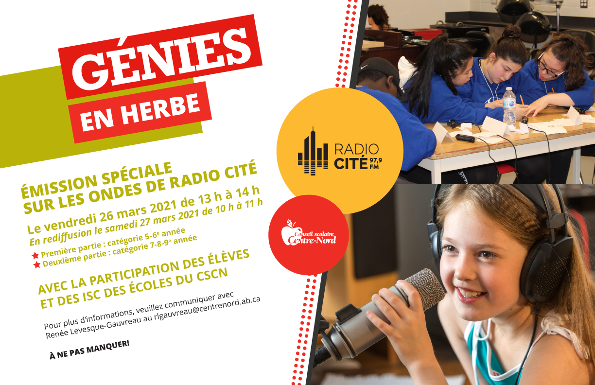 Voir la publicité «Génies en herbe» qui aura lieu sur les ondes de Radio Cité, cliquer ICI.
