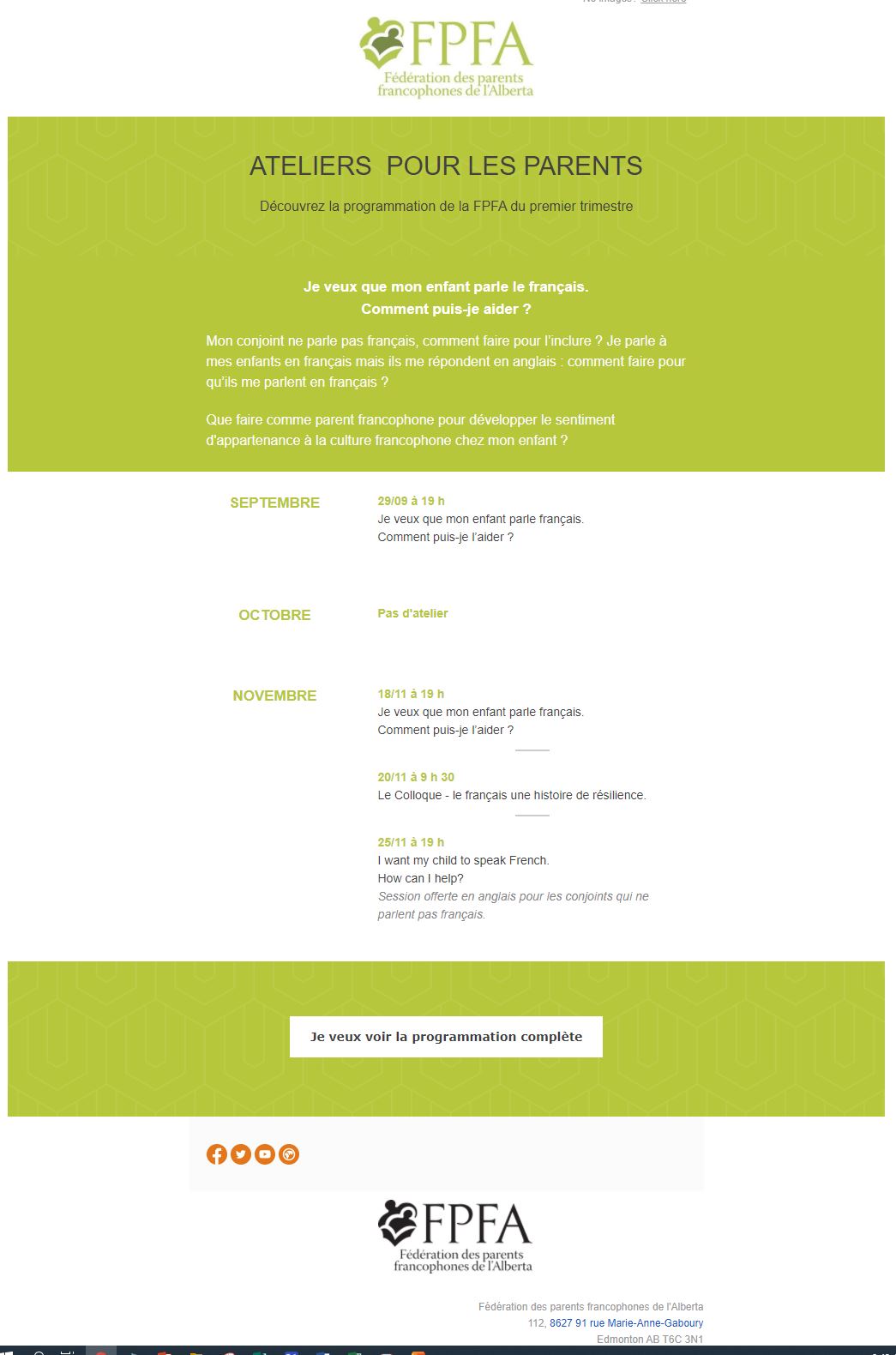 Voir la publicité de la FPFA sur des sessions «Je veux que mon enfant parle français, cliquer ICI.