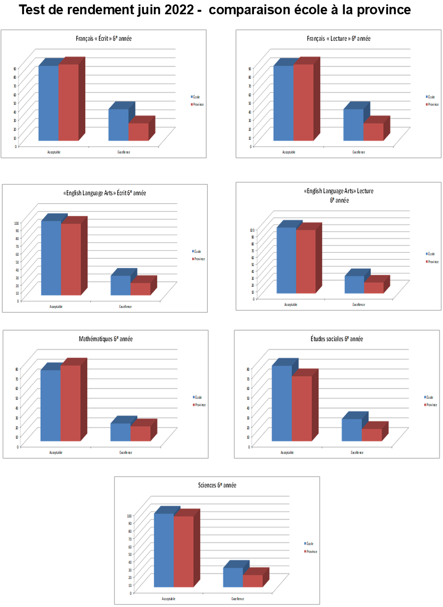 Voir les résultats des tests de rendement de 6e année, juin 2022, cliquer ICI.