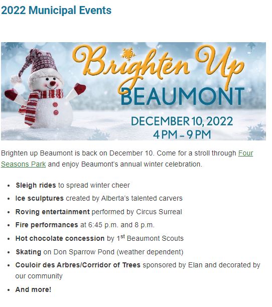 - Voir la publicité de « Beaumont Nisku Christmas Elves » cliquer ICI et pour le moitié moitié, cliquer ICI.